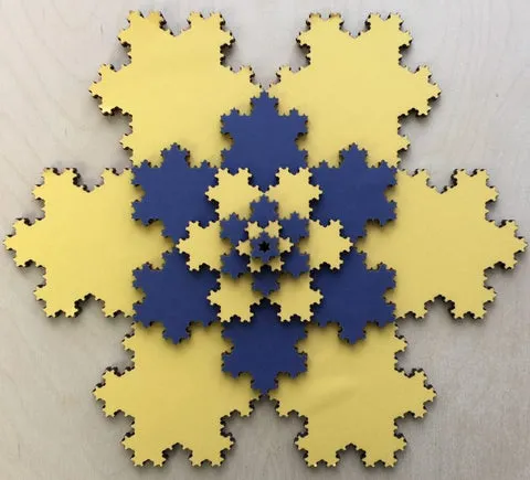 So that led to one of our first puzzles, which uses two sizes of snowflakes. I put the box of pieces in the Mathematics Commons at the University of Michigan. Both of the patterns below were created there.