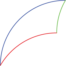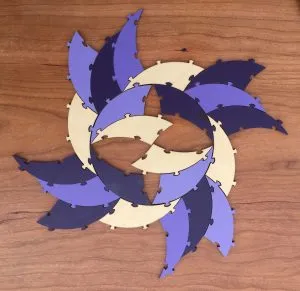 The pieces are oriented, meaning that when you flip a piece over, you can still use the piece but in different ways. You can use both orientations in the same tiling, which makes it different from most of our other sets of tiles. The flexibility of the Tricurve comes from it’s spare geometric and arithmetic properties. The edges are made from a semicircle cut into 3 pieces in the ratio 1:2:3.