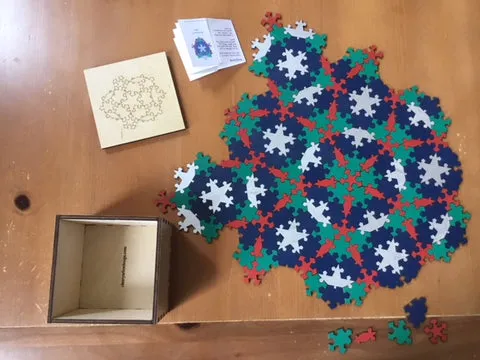 The Penrose tilings, P1, P2, and P3 have many different solutions. It could be different every time, although you are likely to see strong similarities in the patterns. Chet and Esther bought our P1 at the theAtlanta American Craft Councilshow, and wanted to know if there was a solution that used all the tiles. They sent us this image: